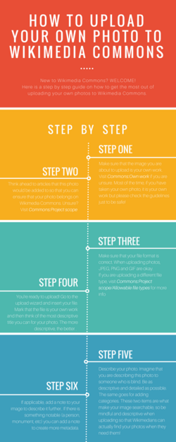 This is a guide for people who wish to contribute their own work to Wikimedia Commons. It describes the requirements for the work to be included and offers advice on "best practices" in the wiki. For suggestions on making pictures, see Commons:How to take pictures for Wikimedia Commons.